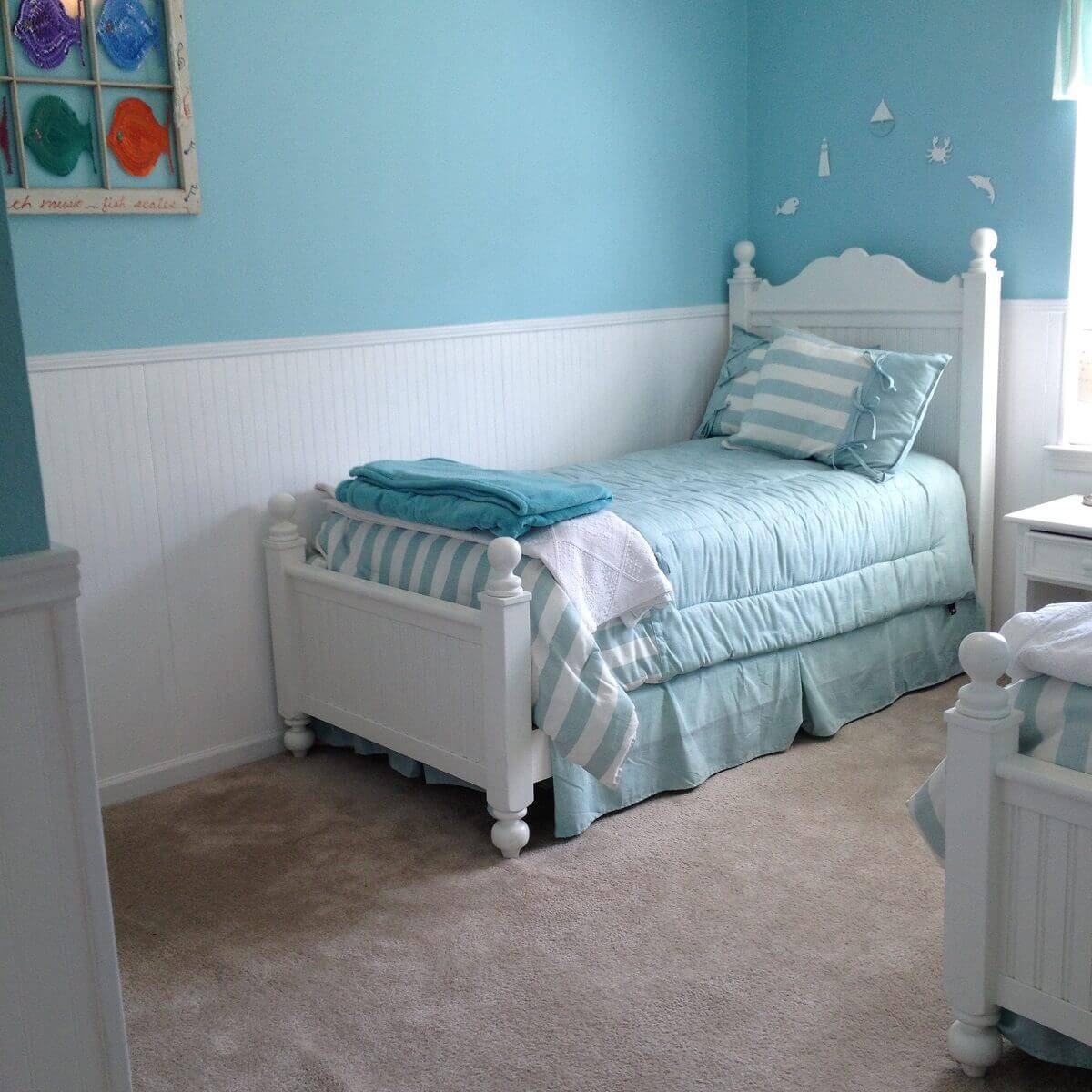 Использовать в детской сочные оттенки циана или светлой небесной бирюзы – решать вам, в любом случае, голубой достаточно универсален, чтобы соответствовать всевозможным пожеланиям и потребностям. Если речь идет о комнате мальчика, то можно создать оригинальный морской дизайн, декорируя стены рисунками или героями из мультфильмов.