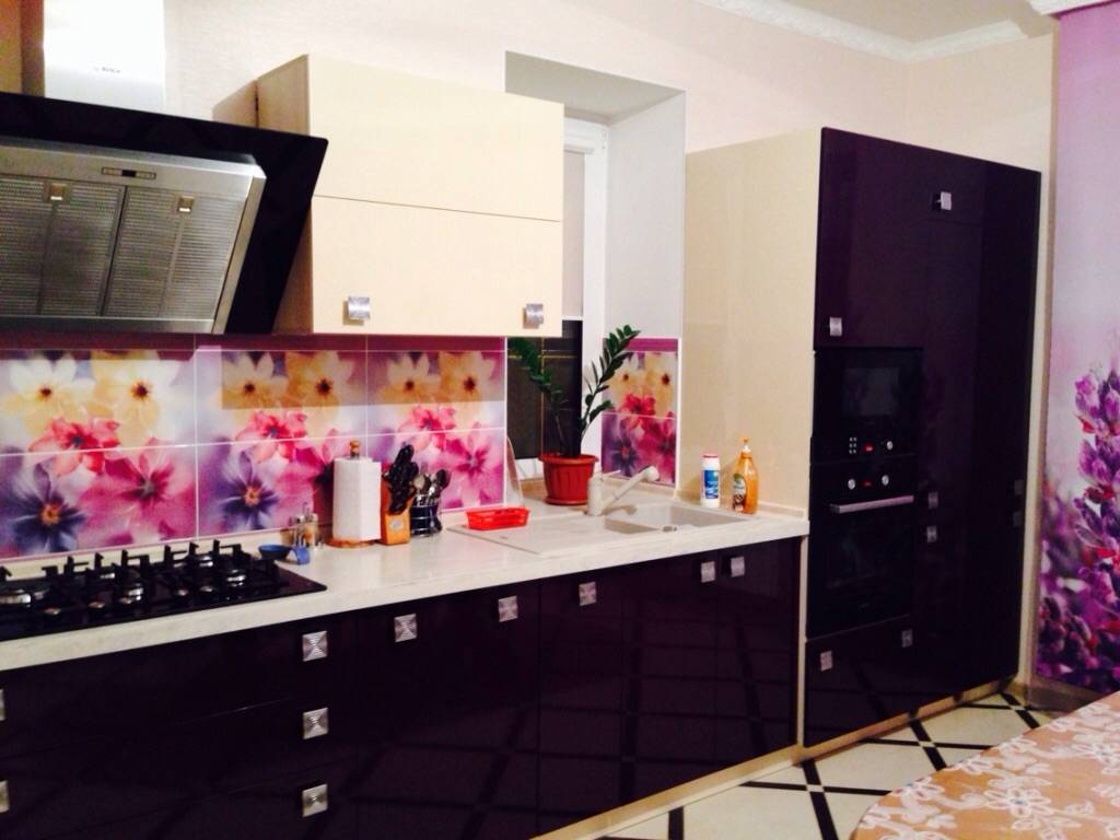 Фартук. Светло-фиолетовые кухонные фасады отлично выглядят с фартуком из стекла с изображением цветов или фруктов. Также хорошо выглядят фартуки из керамической плитки или мозаики светлых тонов.