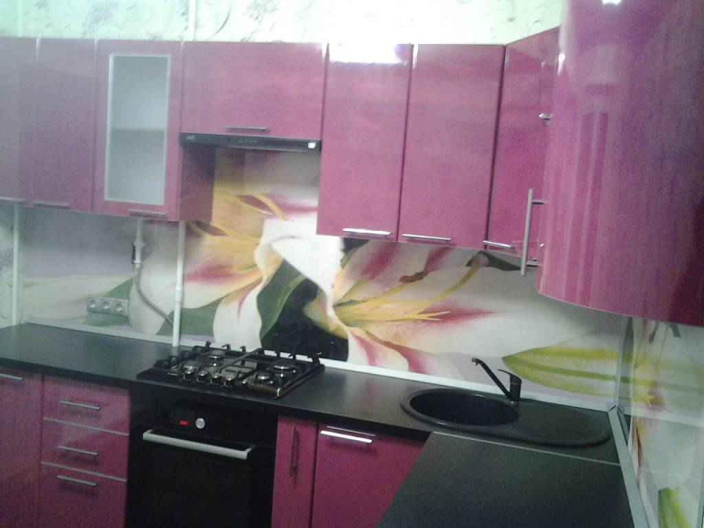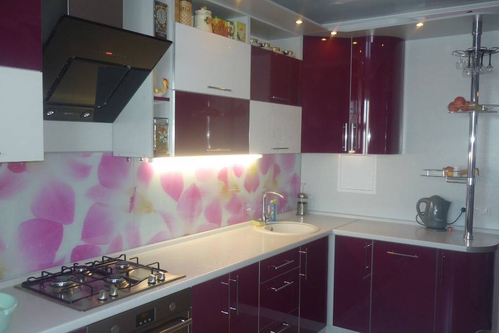 Что касается кухонного фартука, очень красиво на такой кухне будут смотреться стеклянные фартуки (скинали) с фотопечатью в розовых или сиреневых тонах, на которой изображены пейзажи, цветы или ягоды. Если мебель светлая, с ней будет гармонично сочетаться яркий фартук из стекла или плитки фиолетового цвета.