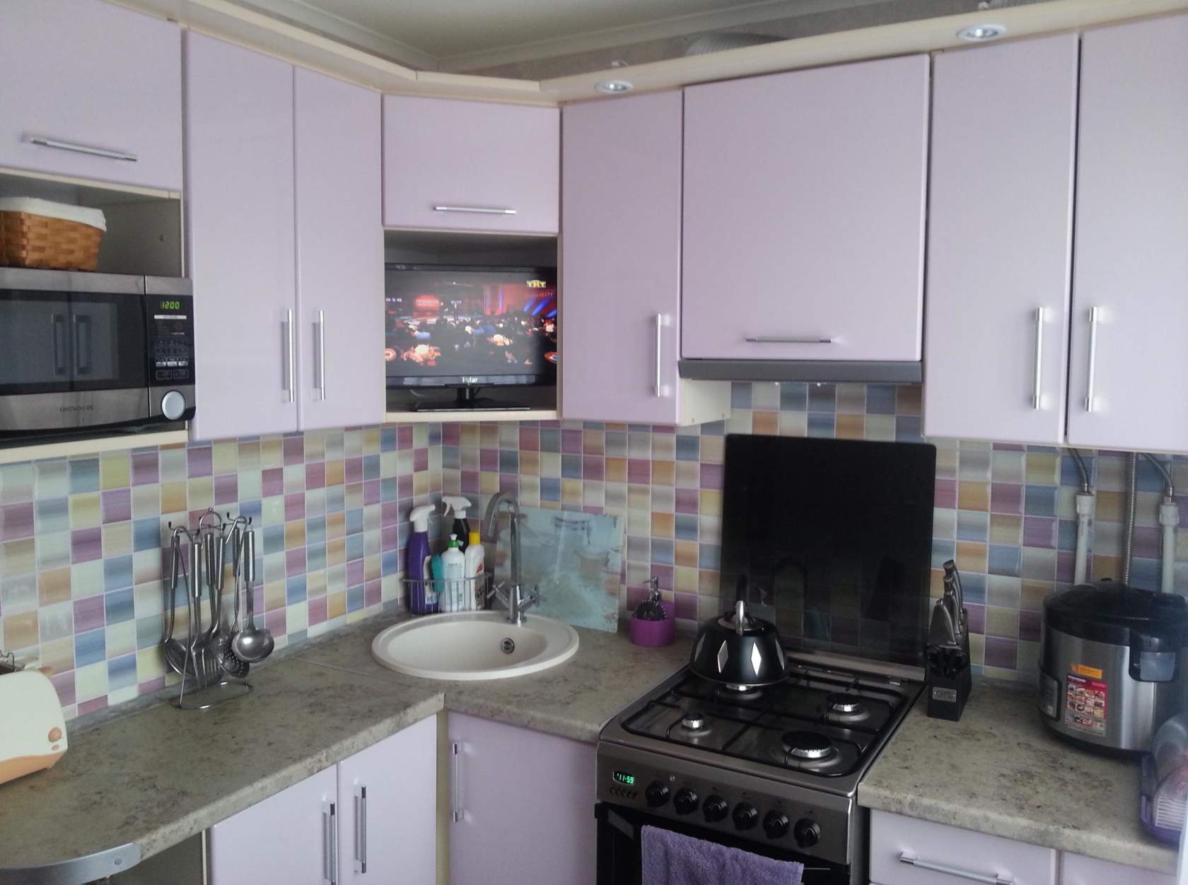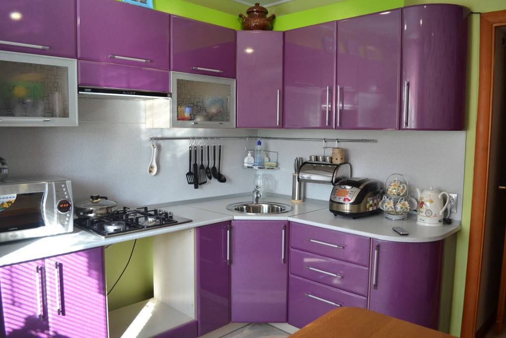 Удачный вариант – это сиреневые фасады гарнитура, которые придадут свежести и оригинальности интерьеру