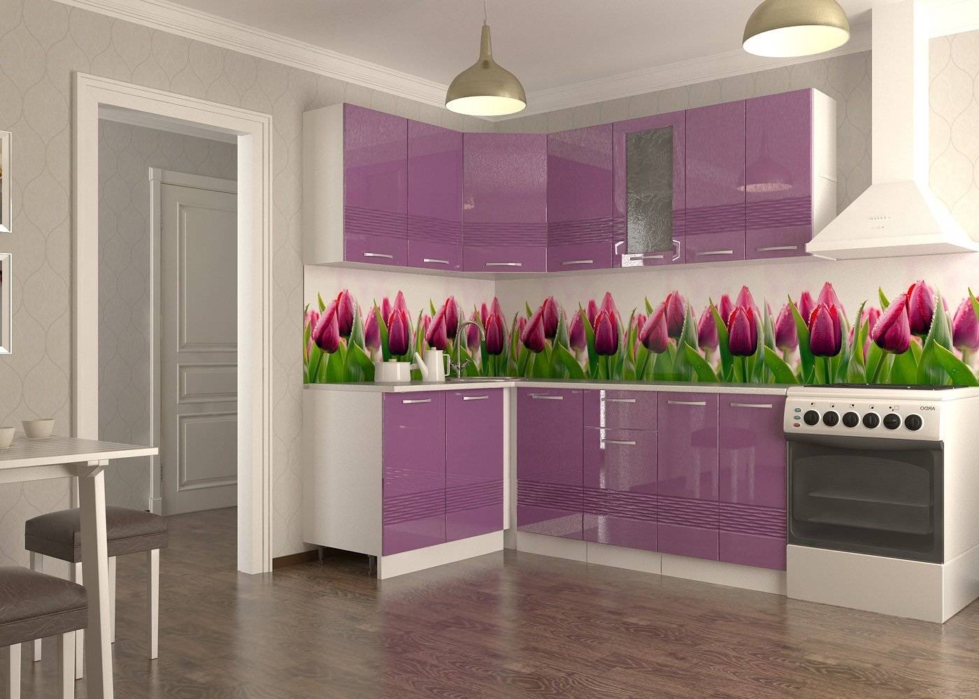 Фартук. Светло-фиолетовые кухонные фасады отлично выглядят с фартуком из стекла с изображением цветов или фруктов. Также хорошо выглядят фартуки из керамической плитки или мозаики светлых тонов.
