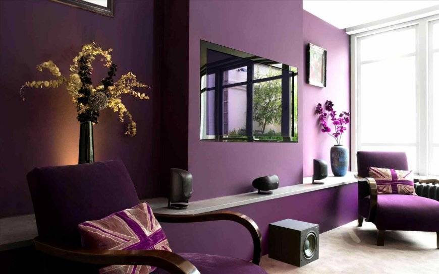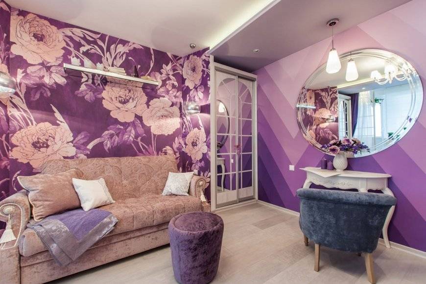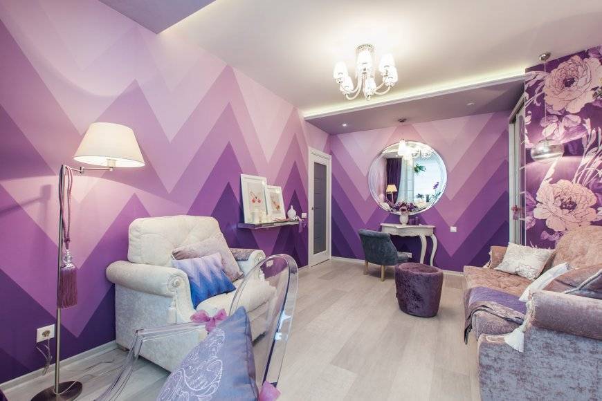 Дизайн гостиной в фиолетовом цвете может быть как ярким, так и нежным, в пастельных тонах. Все зависит от цвета, который вы выберете вторым.