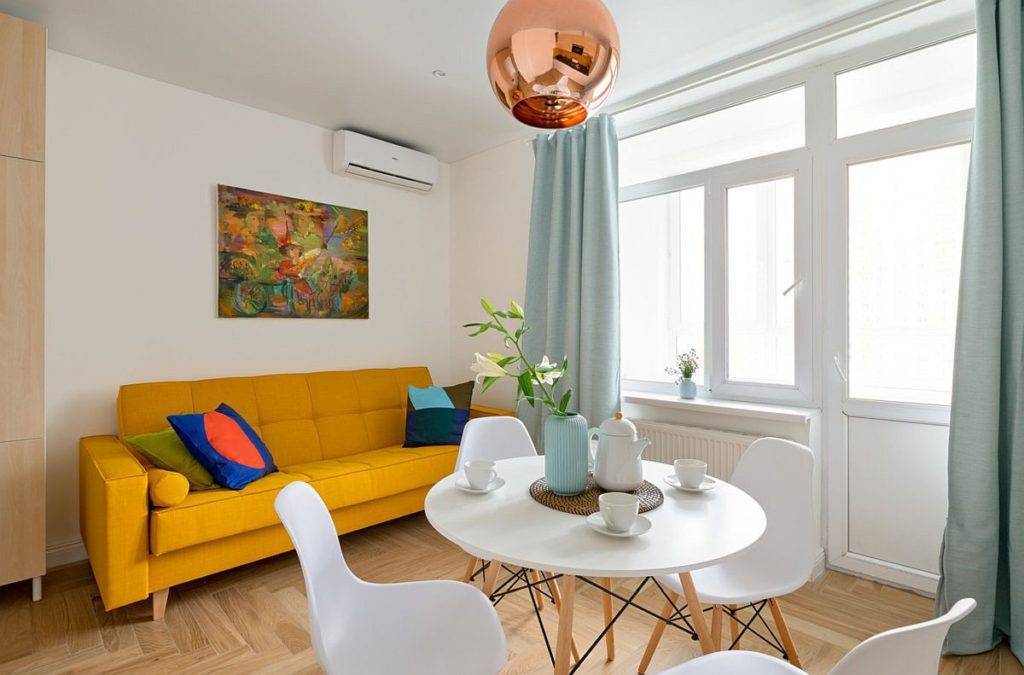 Скандинавский стиль. Благодаря наличию спокойных выдержанных тонов с обилием светлых красок интерьер помогает визуально объединить две функциональные зоны в единую область.