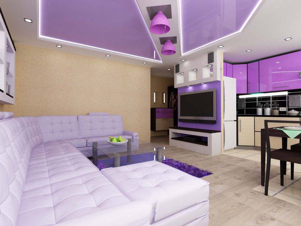 Дизайн гостиной в фиолетовом цвете может быть как ярким, так и нежным, в пастельных тонах. Все зависит от цвета, который вы выберете вторым.
