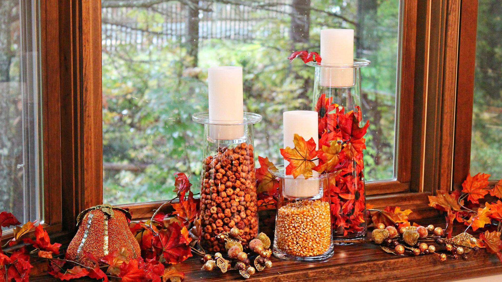 В осеннем декоре преобладают яркие краски: засушенные листья клена, других деревьев, красные ягоды рябины, маленькие тыковки. Такой овощ, как тыква, является традиционным украшением на Хэллоуин, из них получаются очаровательные и чуточку пугающие подсвечники с глазками. Украсить окно осенью можно красивым букетом из листьев, ягод, веточек с шишками в высокой вазе или композицией в прозрачном сферическом сосуде. Не будут лишними свечи в необычных подсвечниках, мягко мерцающие гирлянды, подвесы, сделанные своими руками из ярких бусин, похожих на ягоды, или вырезанных из бумаги листьев.