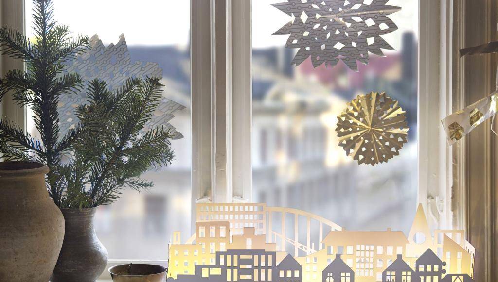 В продаже есть множество светодиодных гирлянд и игрушек: звезд, ангелов, снежинок, оленей, снеговиков, другого праздничного декора. Окно можно расписать специальными красками, изобразив на нем морозные узоры, тематические картинки, подсветить светодиодами или свечами, и ваш дом будет светиться по вечерам, словно сказочная шкатулка. Подсвечники можно приобрести или смастерить своими руками из прозрачных или жестяных банок, зажечь свечи, светодиодные фонарики. Попробуйте украсить окна вырезанными из бумаги и картона силуэтами, – заснеженными городами с подсветкой из тех же гирлянд. Очаровательно смотрятся самодельные гирлянды из ангелочков, снежинок, звезд из белой, цветной бумаги, фольги, – словом, смастерить можно все, что угодно, на что у вас хватит времени и фантазии.