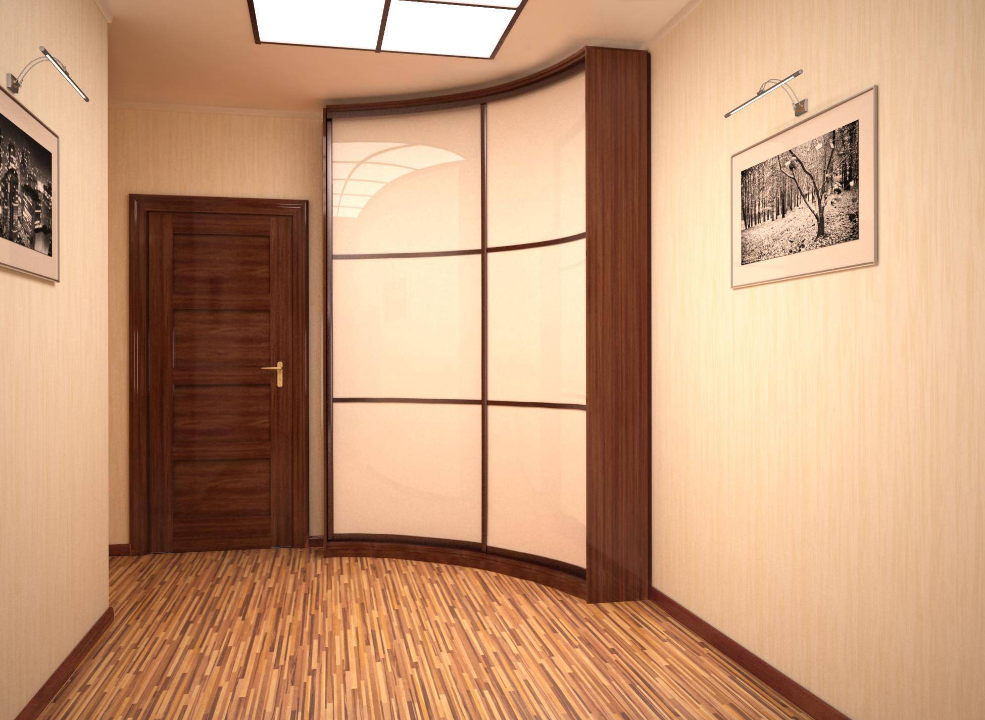 Идеальным решением будет поставить в коридор шкаф-купе. Он отличается от других видов шкафов конструкцией дверей. Она такая же, как в вагонах купе поездов, с использованием роликового механизма.