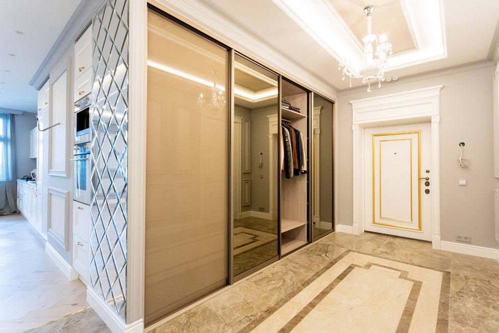 Классика предполагает элегантность и сдержанную роскошь. В таких интерьерах уместны модели из дерева с распашными дверцами или шкафы-купе с имитацией распахивающихся дверей. Классика в современном прочтении допускает и обычные раздвижные конструкции. Цветовая гамма включает натуральные оттенки дерева, а также белый, бежевый и черный цвета.