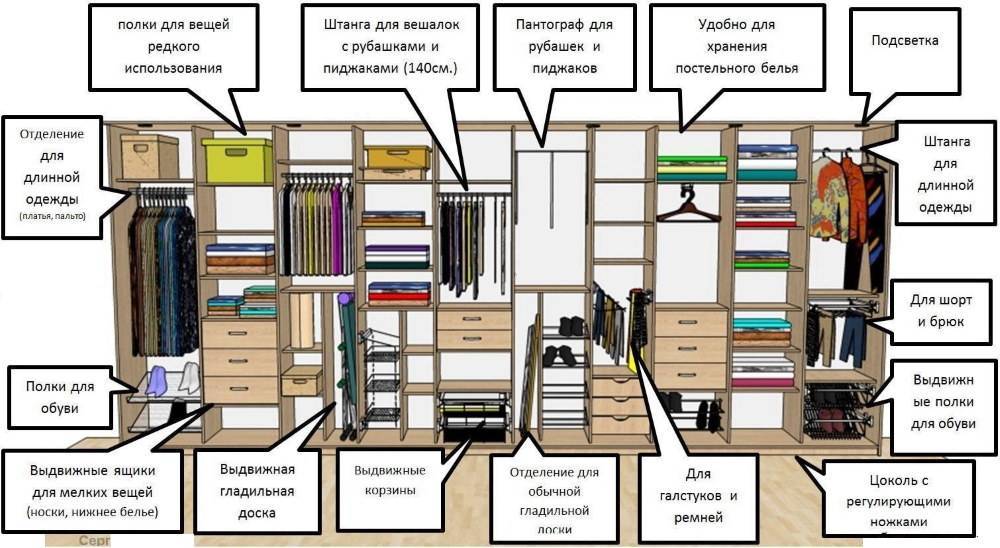 Внутренняя начинка. Перед оформлением заказа продумайте, что будет храниться. Количество полок, вешалок, их расположение и глубина делаются по вашим предпочтениям. Они могут предназначаться для складирования одежды, бытовой техники, спортивного снаряжения и даже откидной кровати.