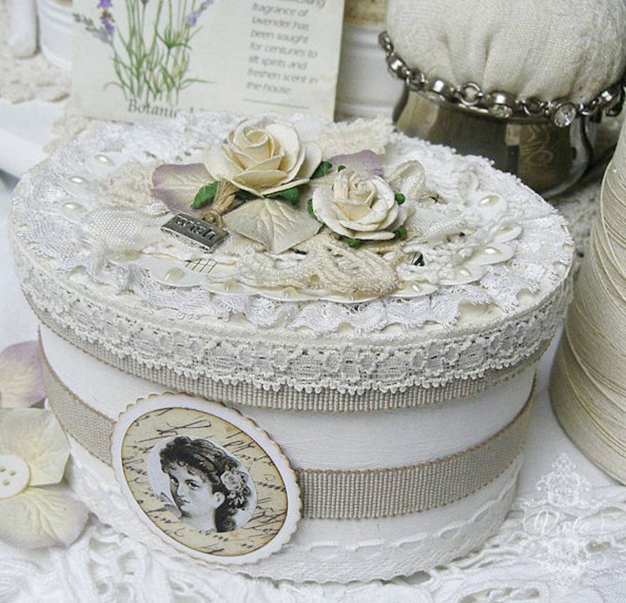 Внутри шкатулку обклейте декоративной бумагой, а сверху украсьте кружевом, рисунками в технике декупаж, готовыми цветами из ткани или бумаги, бусинами.