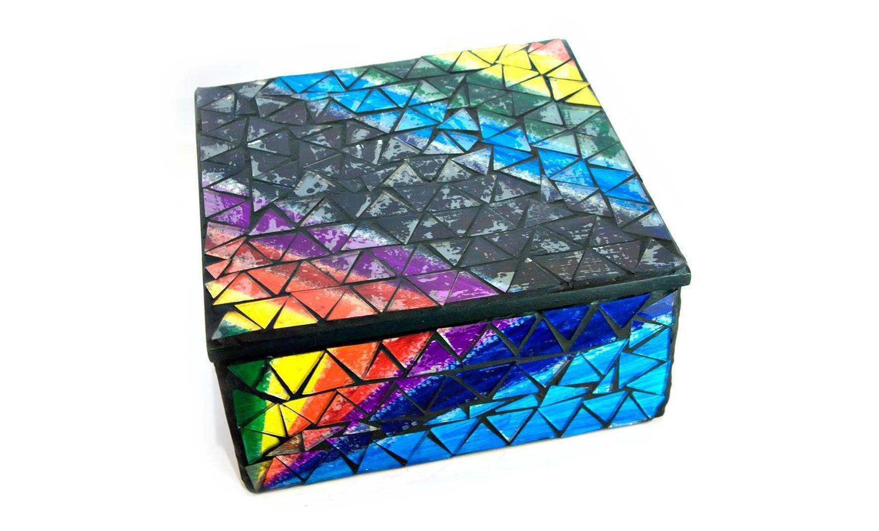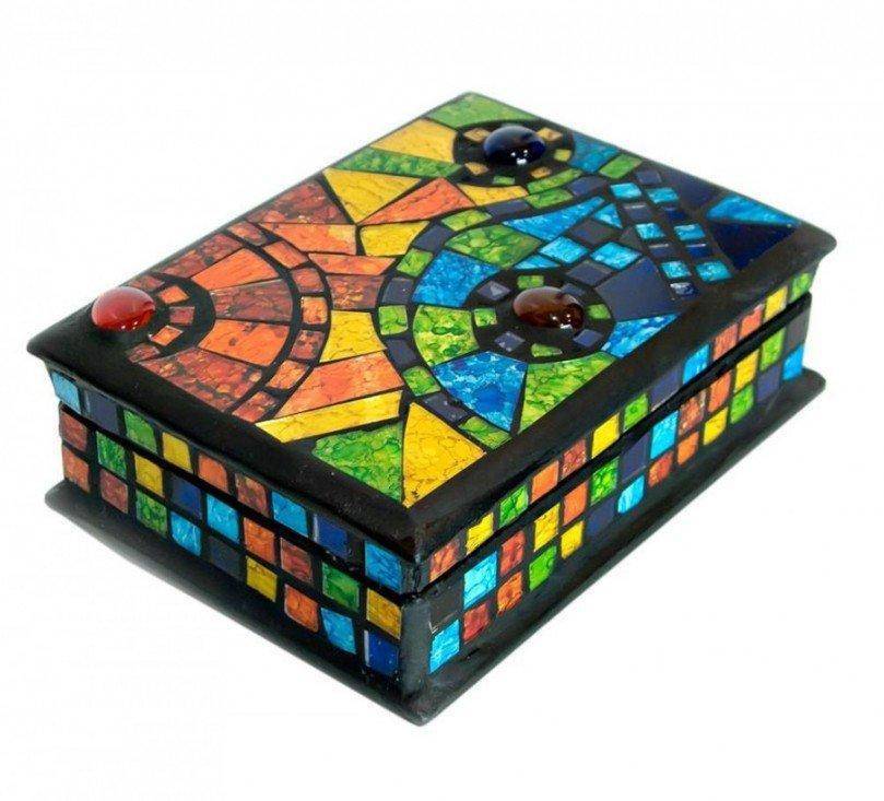 Создать мозаику на наружных или внутренних стенках коробочки можно при помощи использования разноцветных материалов. Наиболее популярным является использование двух цветов, находящихся рядом в цветовой схеме — желтого и оранжевого, голубого и синего, черного и белого. Для изготовления мозаики понадобятся одинаковые квадраты двух выбранных цветных листов. Проводится украшение по следующему алгоритму: