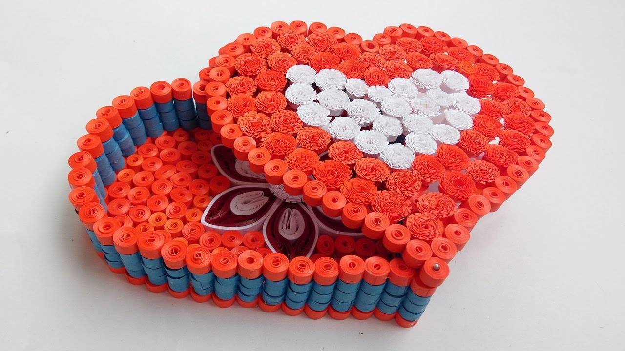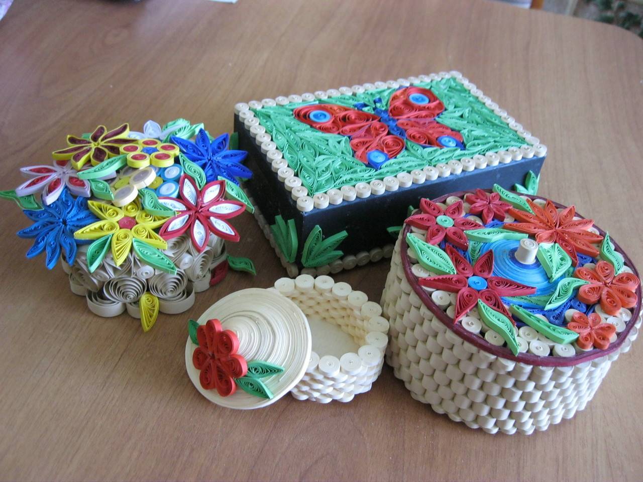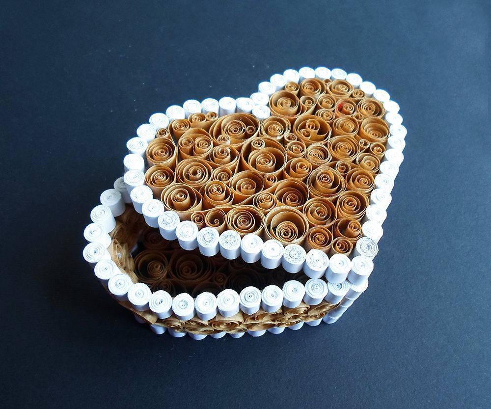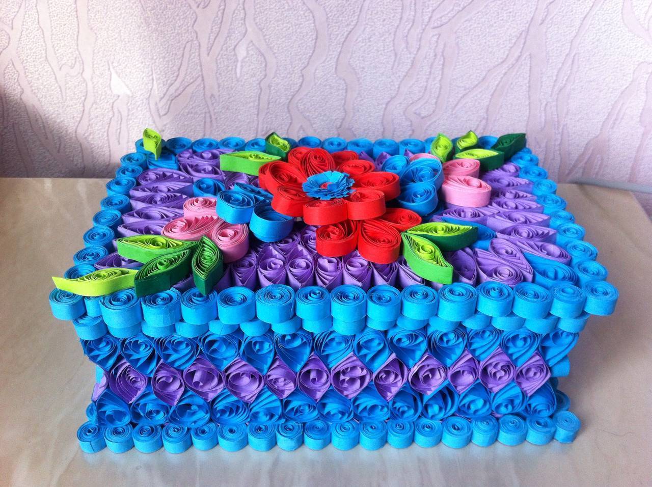 Украшение в стиле квиллинг подразумевает наличие узоров или рисунка из скрученных полос бумаги. Рекомендуется сначала выбрать картинку или рисунок, затем скрутить все полосы и создать из них узор, приклеив ребром полоски ткани прямо к шкатулке. Для более уверенной сборки, после создания всех деталей, рекомендуется выложить картинку на столе, а затем подетально приклеивать узор к поверхности.