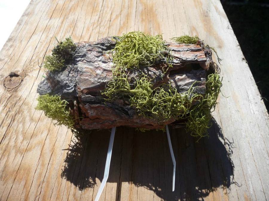 Как сделать скворечник своими руками из подручных материалов? Этот сделан из банки из-под колы, сверху «замаскирован» корой, мхом и еловыми веточками. Этот дом больше подойдет какой-нибудь мелкой, не городской птице. И поместить его лучше всего на сосне или кедре. Если таковые растут на вашем участке. Используя аэрозольный клей, кору и натуральный мох наклеивают на всю поверхность банки для того, чтобы обеспечить изоляцию и маскировку.