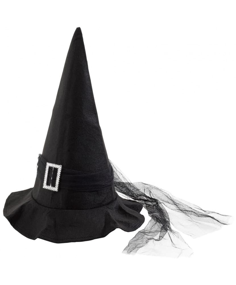 Остроконечную ведьмину шляпу из ткани украшают полупрозрачной сеткой. Вуаль пришивают к полям «изнутри». Большой «купол», который будет свисать со всех сторон головного убора, собирают под черную неприметную резинку и надевают сверху. Шляпы декорируют яркой шнуровкой, летучими мышами, змеями, пряжками, пучками перьев, паучками, картинно сползающими по ниточке с острого кончика. Великолепно смотрятся модели, изготовленные из черного шелка и декорированные ярко-оранжевыми «букетами» кленовых листьев. Скромные, но загадочные шляпки украшают серебряными нитями, опутывающими колпак. Дополняют декор крошечными стразами или звездочками. Чтобы подчеркнуть мрачный стиль, используют черепа, «коготки» мелких животных, миниатюрных воронов, которые водружают на поля головного убора. Оригинальный декор можно связать крючком. К примеру, легкий колпак из серой пряжи (ажурная вязка), будет имитировать паутину на черной шляпе.