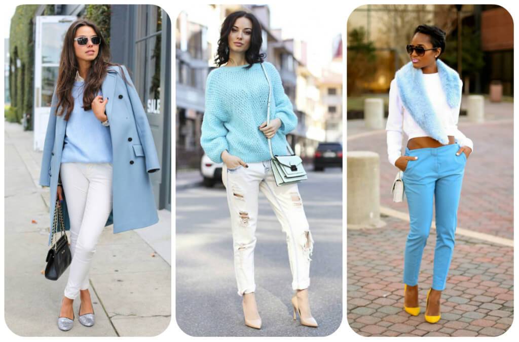 Голубые оттенки встречается в природе достаточно часто, это цветовая гамма неба и воды, потому и сочетаться могут практически со всеми цветами радуги.