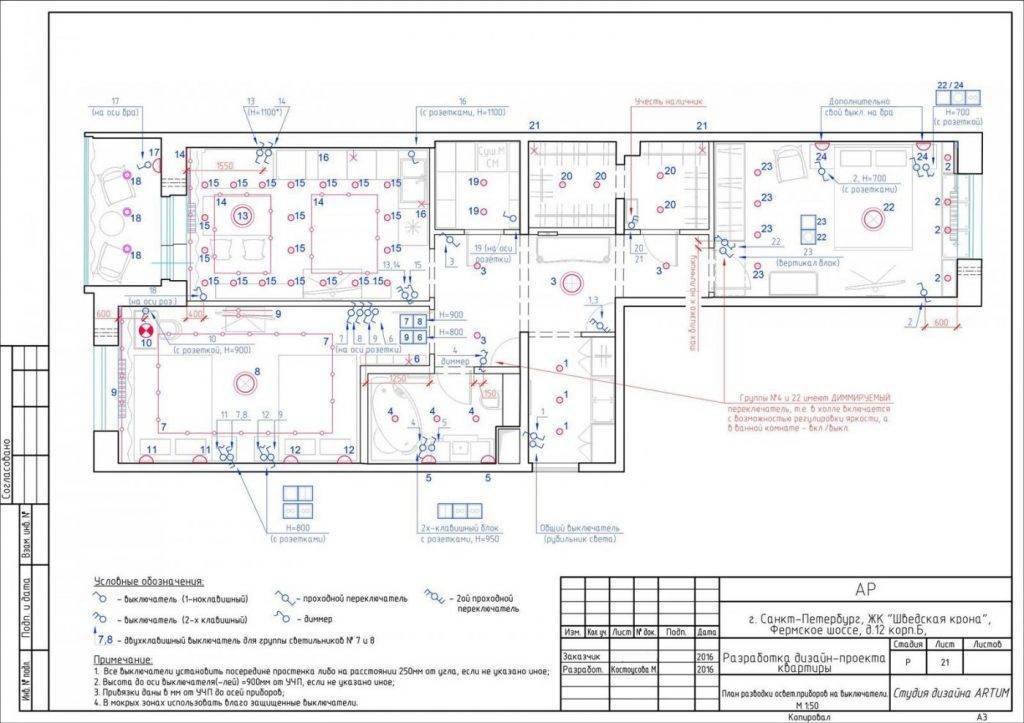 - чертежи с указанием расположения осветительных приборов, розеток, выключателей, бытовой техники и электропроводки.