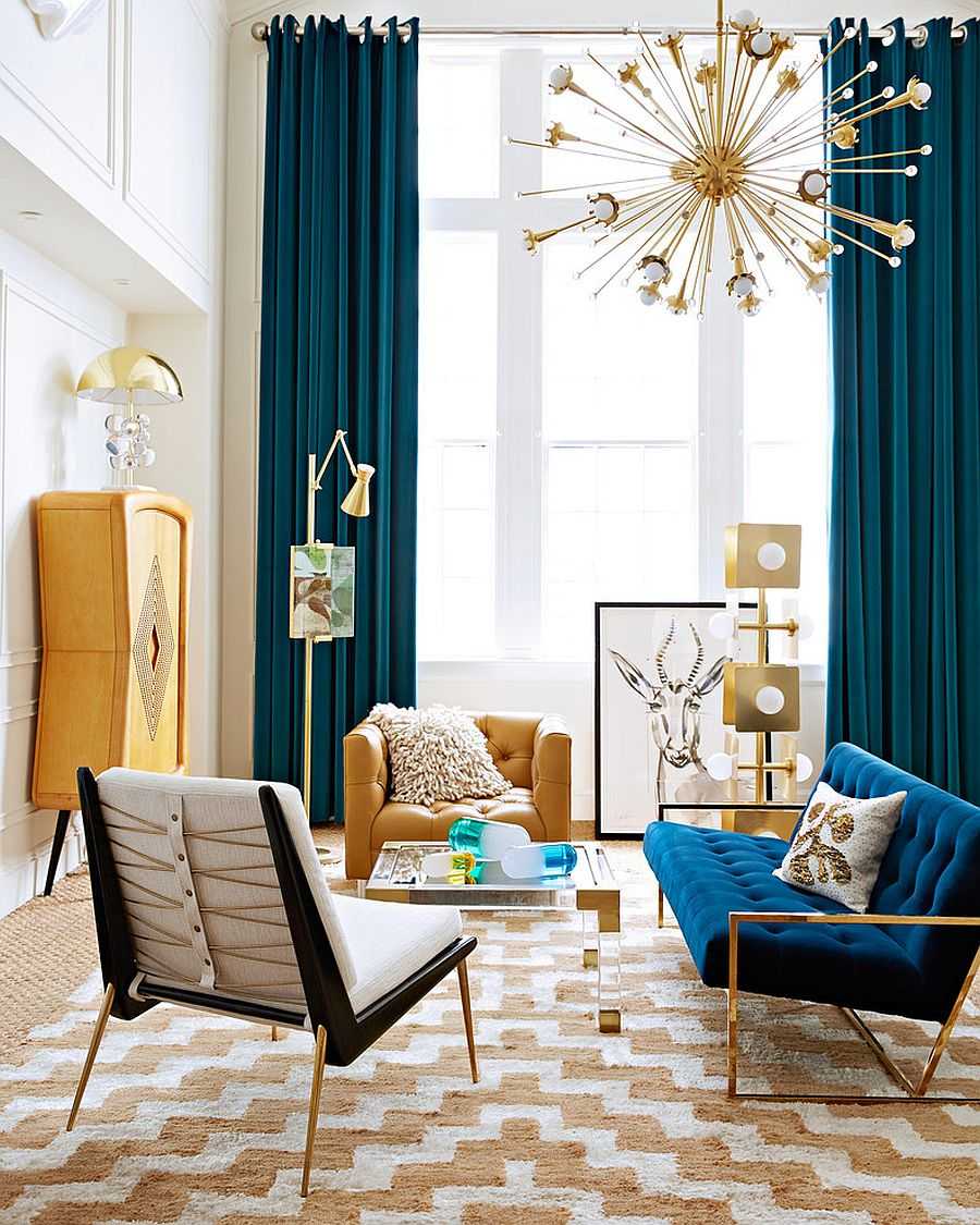 Синие портьеры уместны в комнатах с большим количеством света, потому что создадут ощущение свежести. К ним желательно подобрать декор персикового или янтарного оттенка.