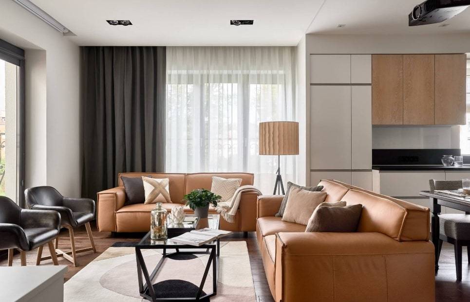 Для минимализма не подходят яркие ткани и броские рисунки. Для такой гостиной вбирайте легкие светлые портьеры бежевых, серых и белых оттенков.