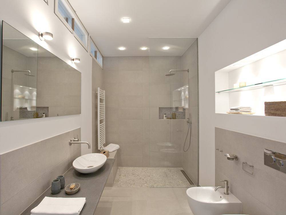 Не переусердствуй с линейной планировкой, чтобы ненароком не получить вагон поезда – сделай несколько акцентов поперек. Это может быть сама ванна у дальней короткой стены, порожек для перехода между разными цветами плитки или невысокий пуфик в углу.