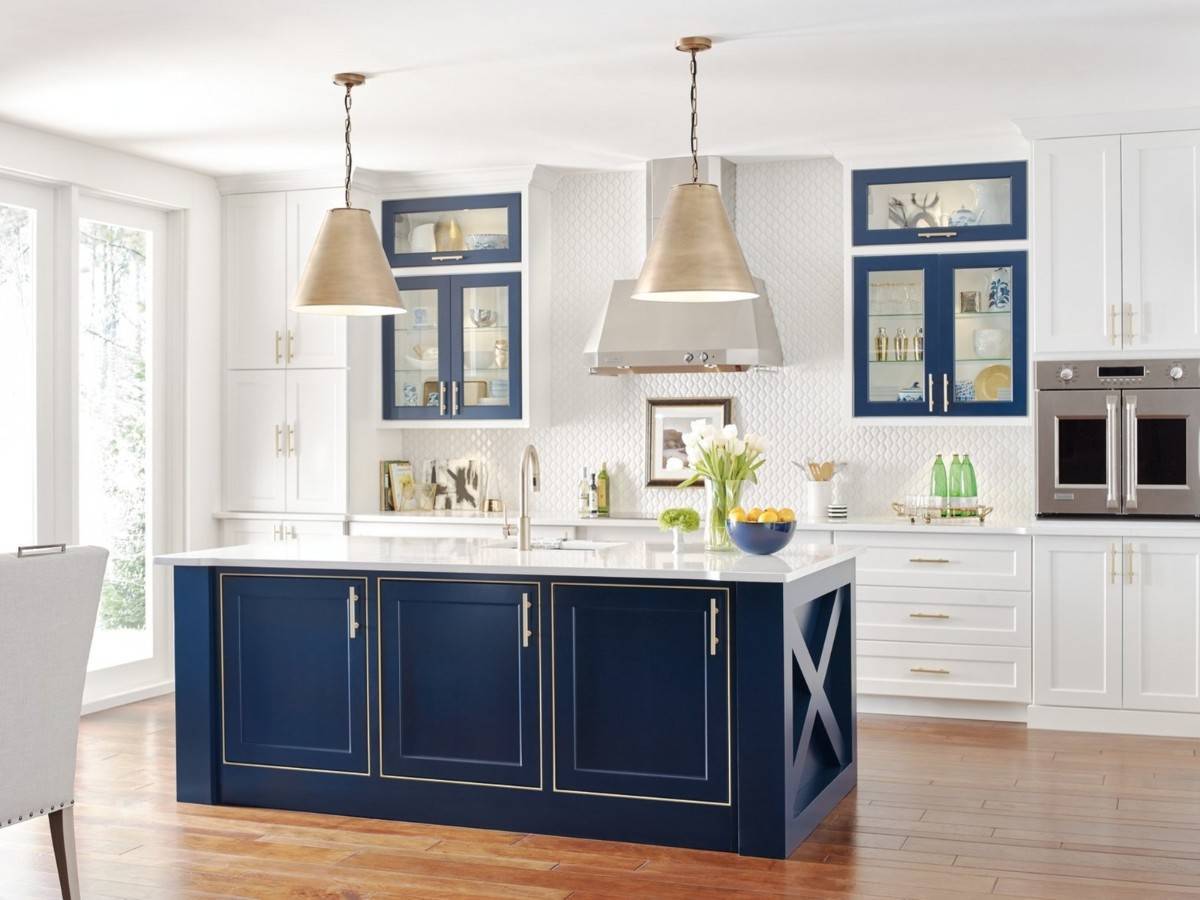 Посмотрим теперь, как это работает. На этой кухне основным выступает белый, дополнительным — бледно-голубой, а синий цвет использовали для расстановки акцентов. В целом дизайн получился «живым» и динамичным.