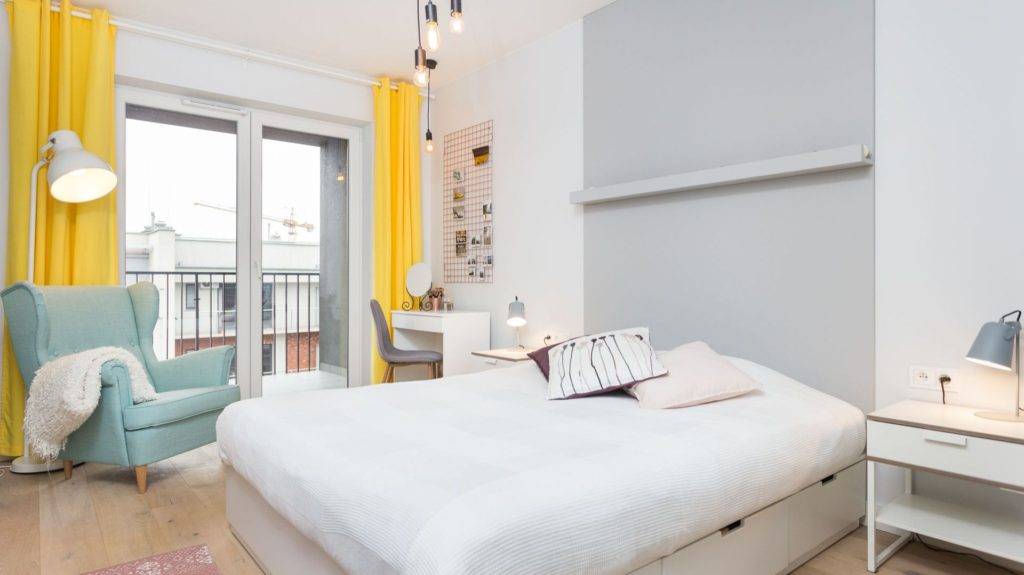 В гостиной акцентами становятся коврики, диванные подушечки, пледы, шторы, вазы или шкатулки на полках, светильники, люстры и отдельные части журнальных столиков или стеллажей. На кухнях интерьер шлифуют за счет ярких фартуков, посуды, комнатных растений, скатертей (для обеденной зоны), штор и столешниц. В спальне обычно все акценты сосредотачивают на стене у изголовья кровати. В результате получается, что яркие краски на палитре есть, но спящие люди их не замечают, что соответственно не мешает сну. Также в этой комнате используют броские шторы, подушечки, покрывала. В прихожих ограничиваются парой картин на стенах, ковриком под дверью и скамеечкой для переобувания. В детских комнатах яркие краски используют повсеместно: чем пестрее обстановка (в рамках меры конечно), тем активнее развивается ребенок.