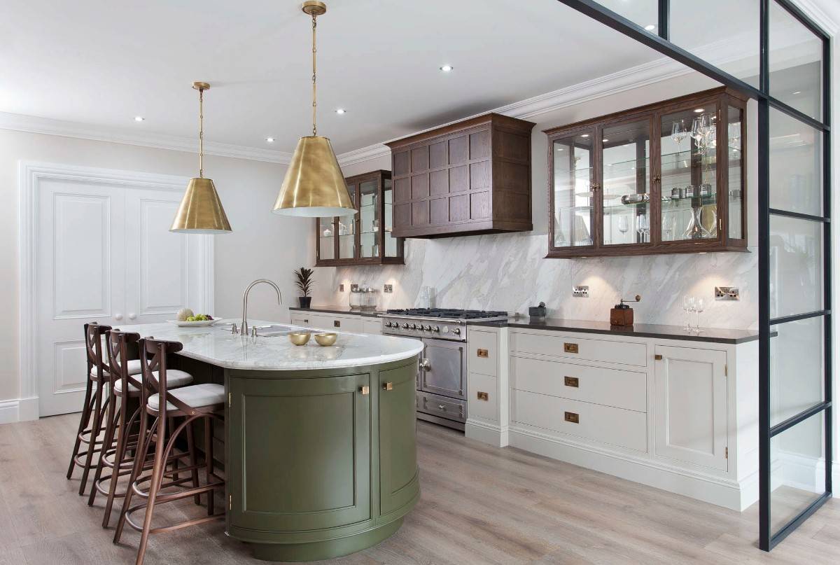 Медные подвесные светильники гармонируют с деревянными шкафчиками и кремовым фартуком кухни. Тёплые оттенки создают приятный контраст с зелёными растениями в гостиной.