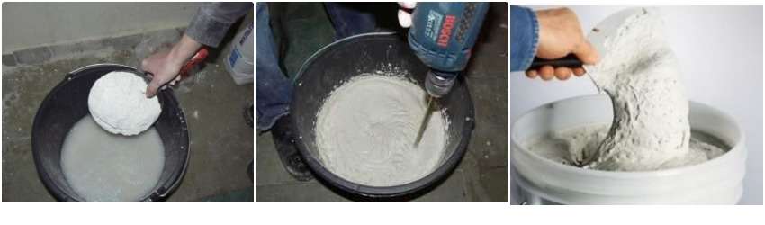Полученную суспензию оставляют для разбухания на 5 минут. Далее готовят раствор. При этом лучше использовать электродрель со специальной насадкой. Замешивание проводят в течение 5 минут с небольшими перерывами до получения однородной, без комочков, шпаклевки. После ее выработки емкость необходимо тщательно вымыть.