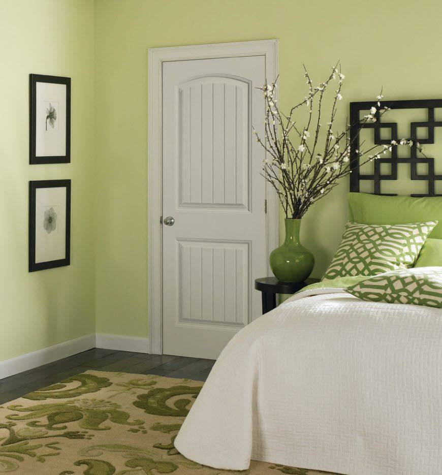 Здесь можно увидеть классическую спальню. Цветовая гамма выдержана в белом и светло-салатовом цвете. Данная палитре в моде, так как сейчас на вершине экологическая тематика. Что подтверждает наличие как живых растений, так ьера присутствуют гладкие линии, минимум острых углов. Акцент над кроватью обрамляют зеркала, чтобы, во-первых, отделить картину от основных цветов, во-вторых, немного расширить простри изображений над изголовьем, которое играет роль акцента. Глядя на потолок, видно, что здесь применяли гипсокартонную конструкцию, которая ограничила часть потолка для подчеркивания зеленой части наверху.