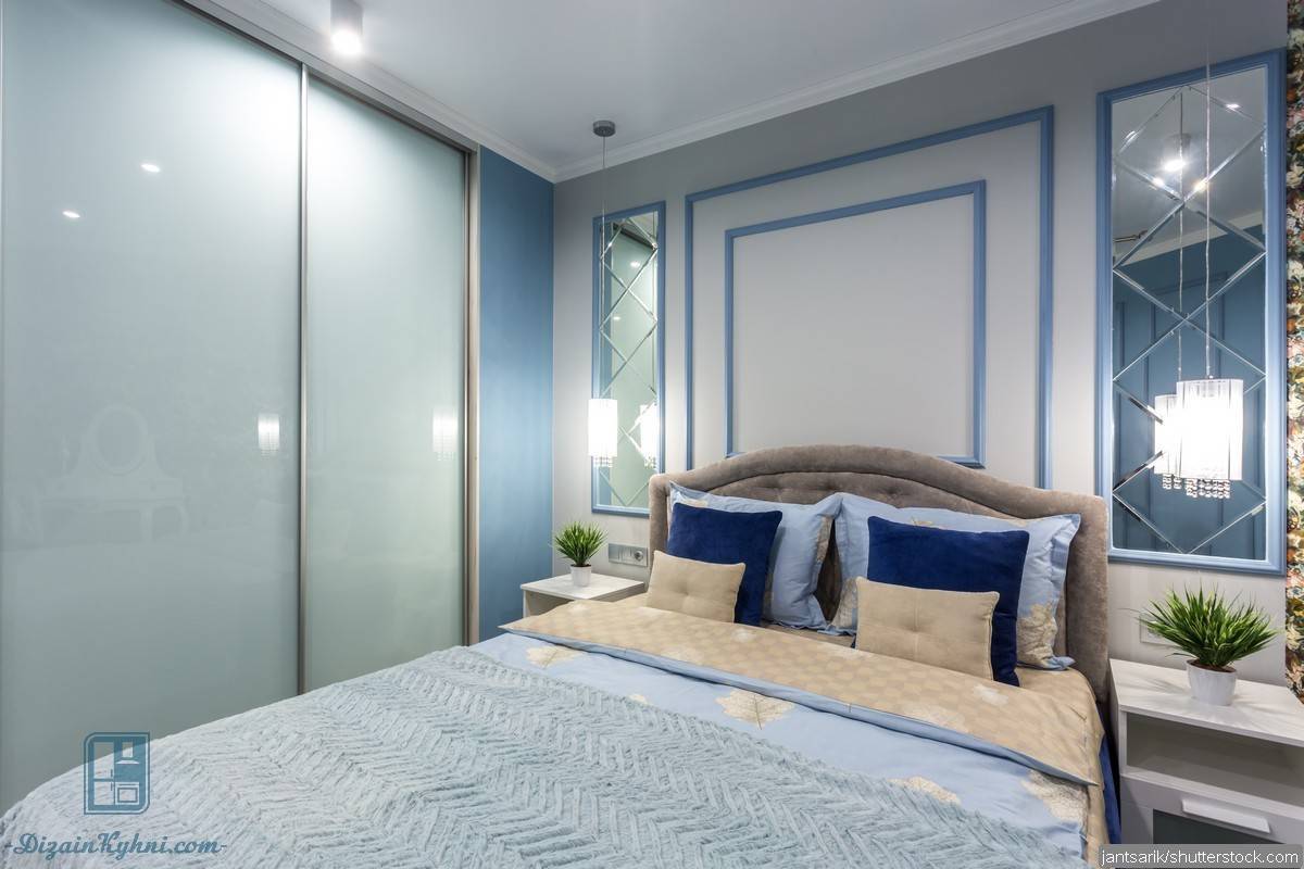 Наличие зеркала. Зеркальные покрытия в узких спальнях делают масштабными. Только их размещают вдоль стены так, чтобы спальное место не отражалось.