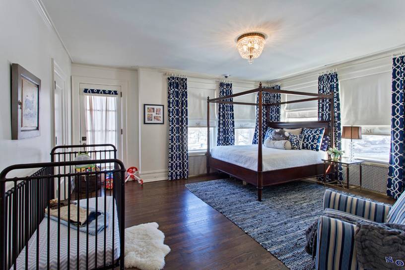 Идеальный вариант разделение комнат на две части (зонирование). Это целое искусство. Такое разделение может создать абсолютно разный дизайн спальни с детской кроваткой. Самый простой вариант это использование балдахина над детской кроваткой. Кружевной, различных расцветок, хороший вариант его использовать, когда спит ребенок. Усовершенствованный вариант, использование ширмы с различными орнаментами. Либо вы можете установить небольшую стенку из гипсокартона.