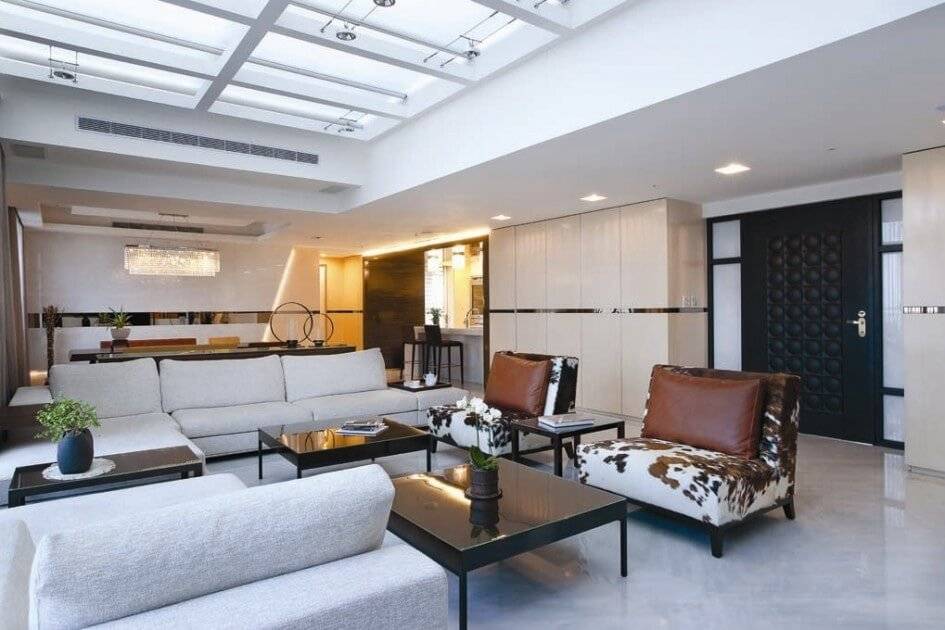С помощью двухцветного оформления можно разграничить пространство кухни, совмещенной с гостиной. Для более четкого зонирования можно установить барную стойку, остров или другие модульные конструкции.