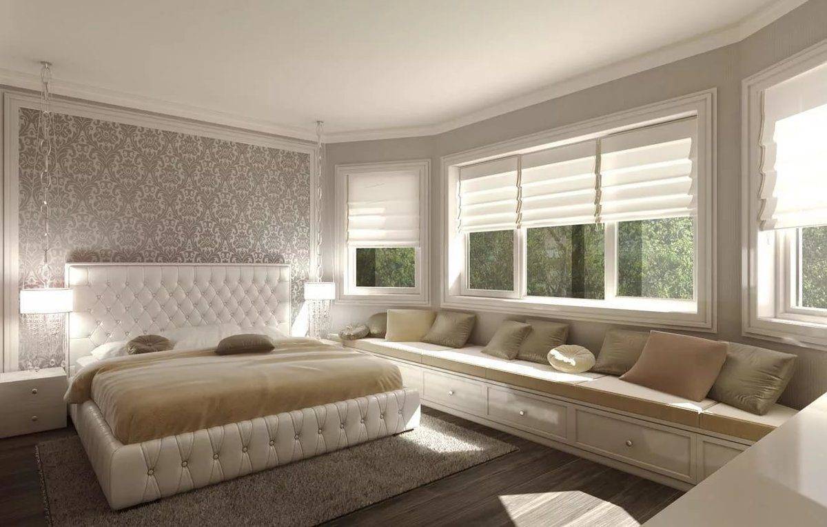 В условиях большой спальной комнаты можно разместить не только кровать и прикроватные тумбочки, но и гардеробную, туалетный столик с высоким зеркалом, кресла, банкетки и рабочий стол.