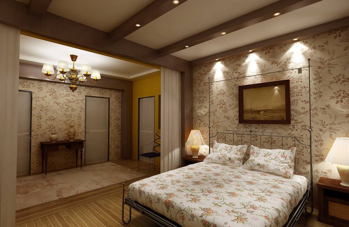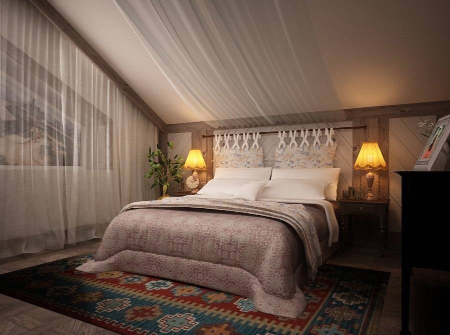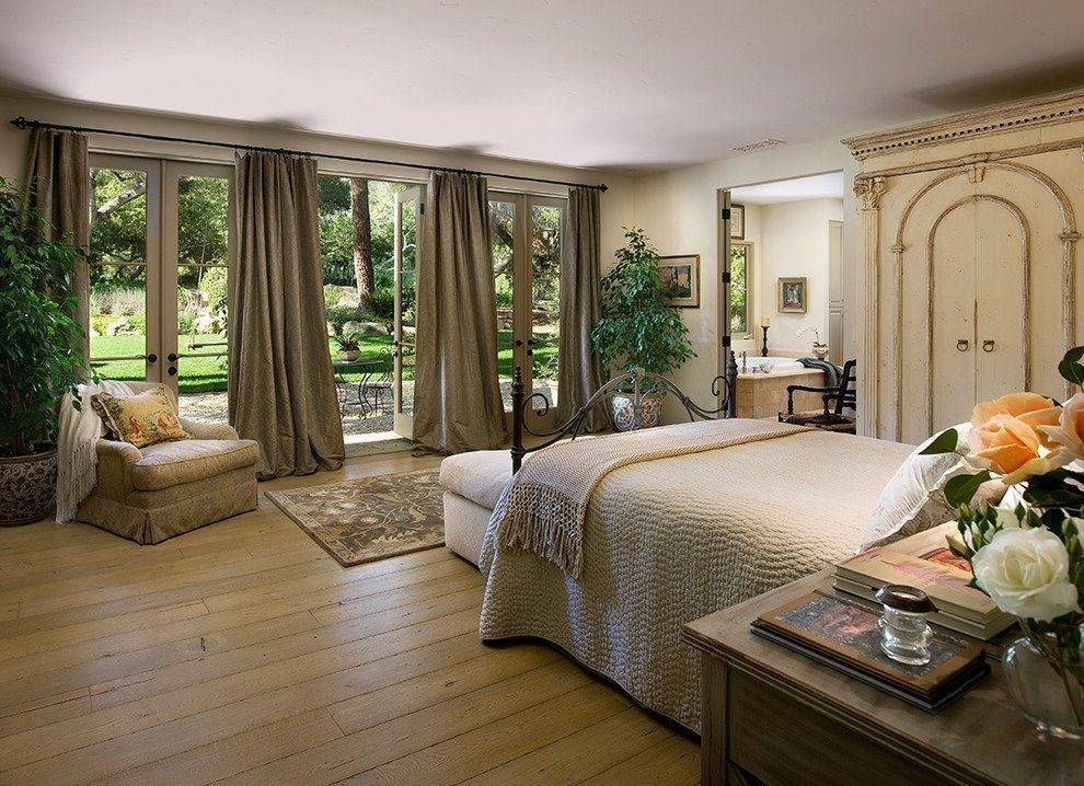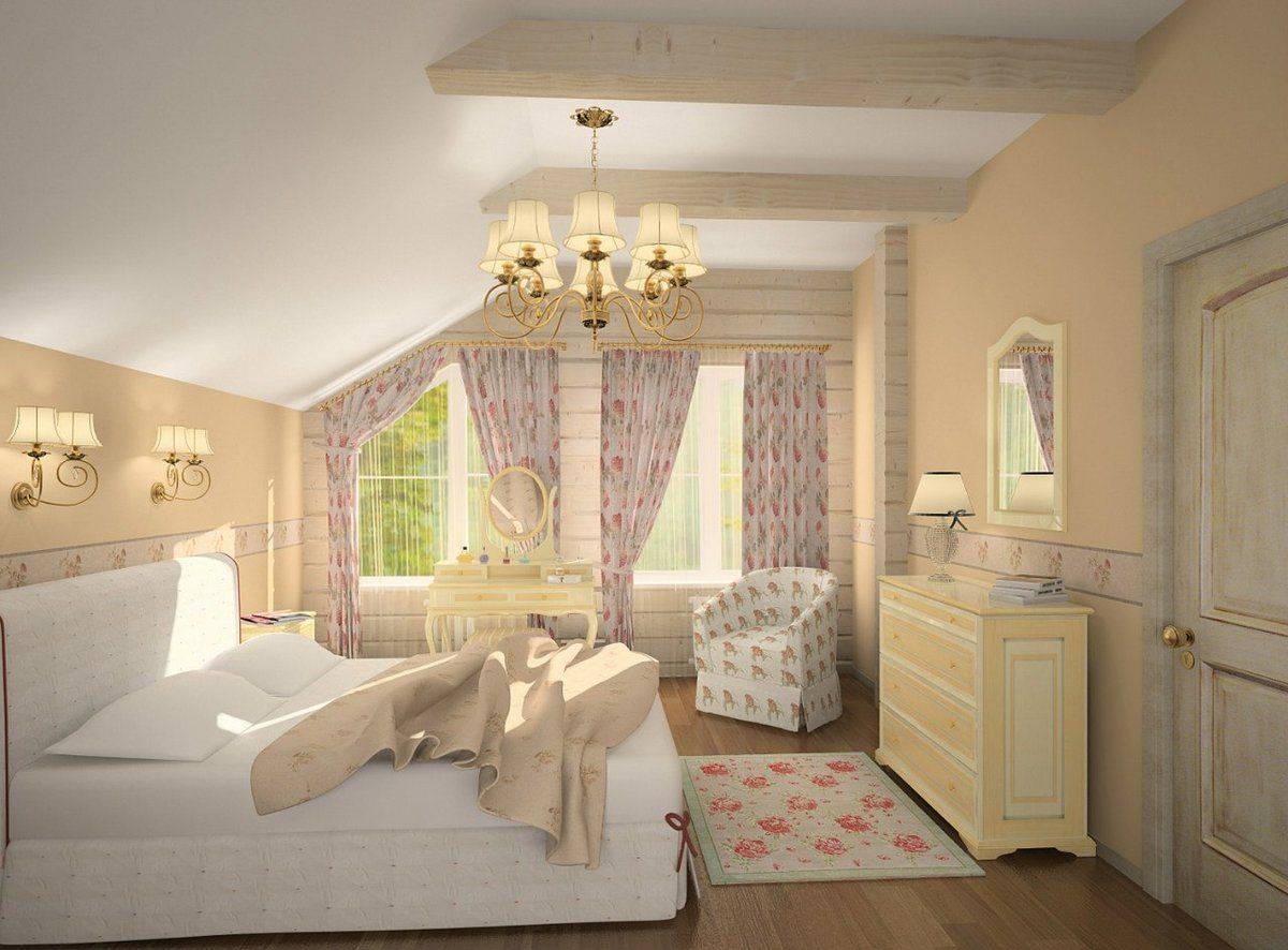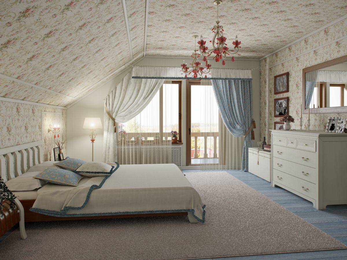 - Прованс. Данный стиль прекрасно подойдет для спальной комнаты в частном доме, благодаря использованию большого количества пастельных цветов в интерьере. Также хорошо будут смотреться громоздкие окна с занавесками из текстиля в рисунок из цветов, а из напольного покрытия лучше всего выбрать древесину.