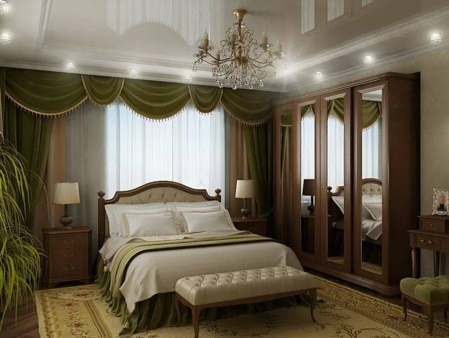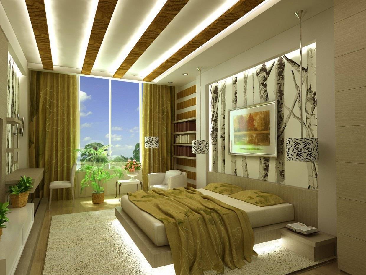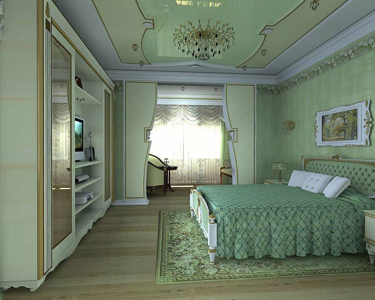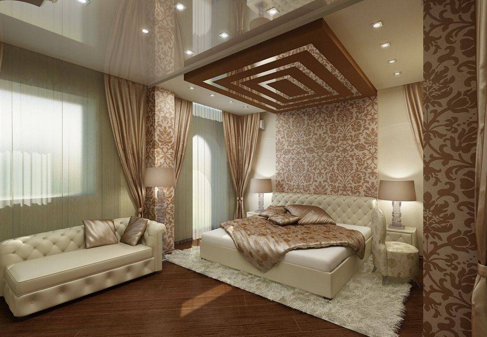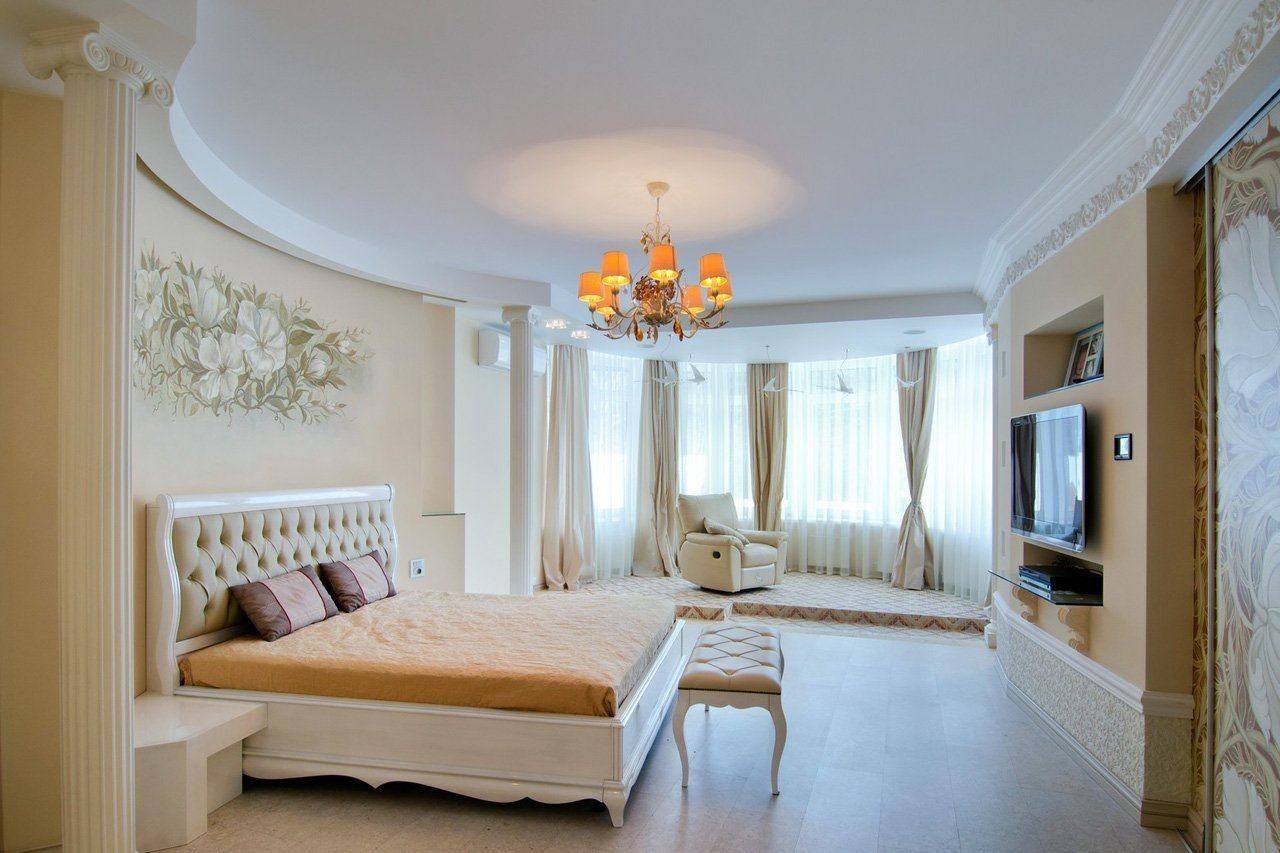 Высота 2,7 м. Красивый вид потолку придадут натяжные конструкции, для крепления которых необходим небольшой каркас. Натяжные потолки обеспечивают идеально ровную поверхность и способны защитить спальню от затопления сверху.