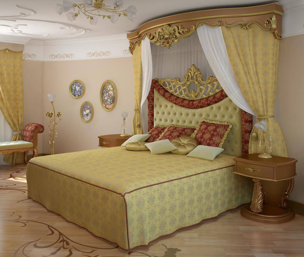 Декор для потолка выбирается в зависимости от его высоты. Чтобы не допустить визуального уменьшения объема спальни, используют следующие принципы: