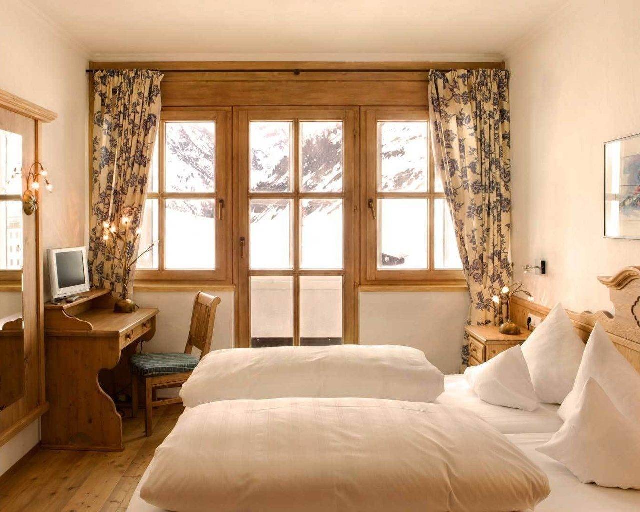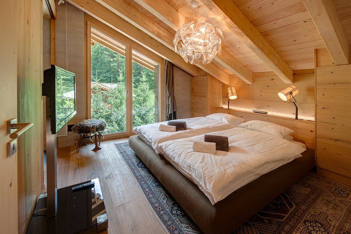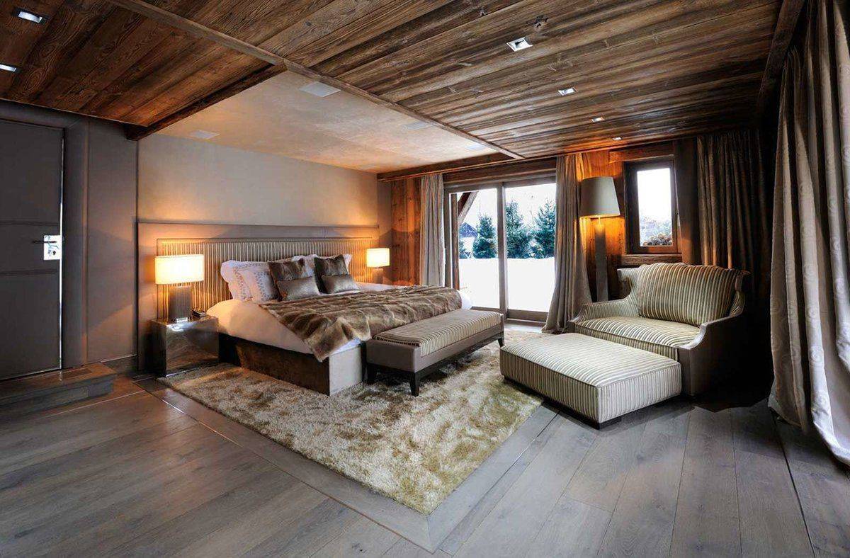 - Шале. Данный стиль ассоциируется с наличием балок, окон большого размера, коврами, мебели из древесины простой формы.