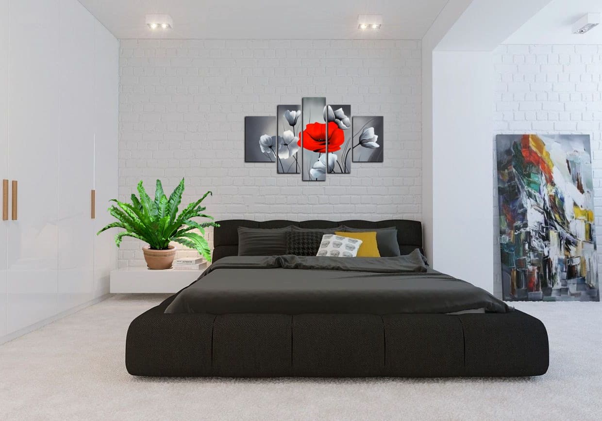 Галерея цветов основана на глубоких серых, коричневых и белых тонах — более темные расцветки придадут комнате элегантность и загадочность, но украшение спальни такими цветами может угнетать.