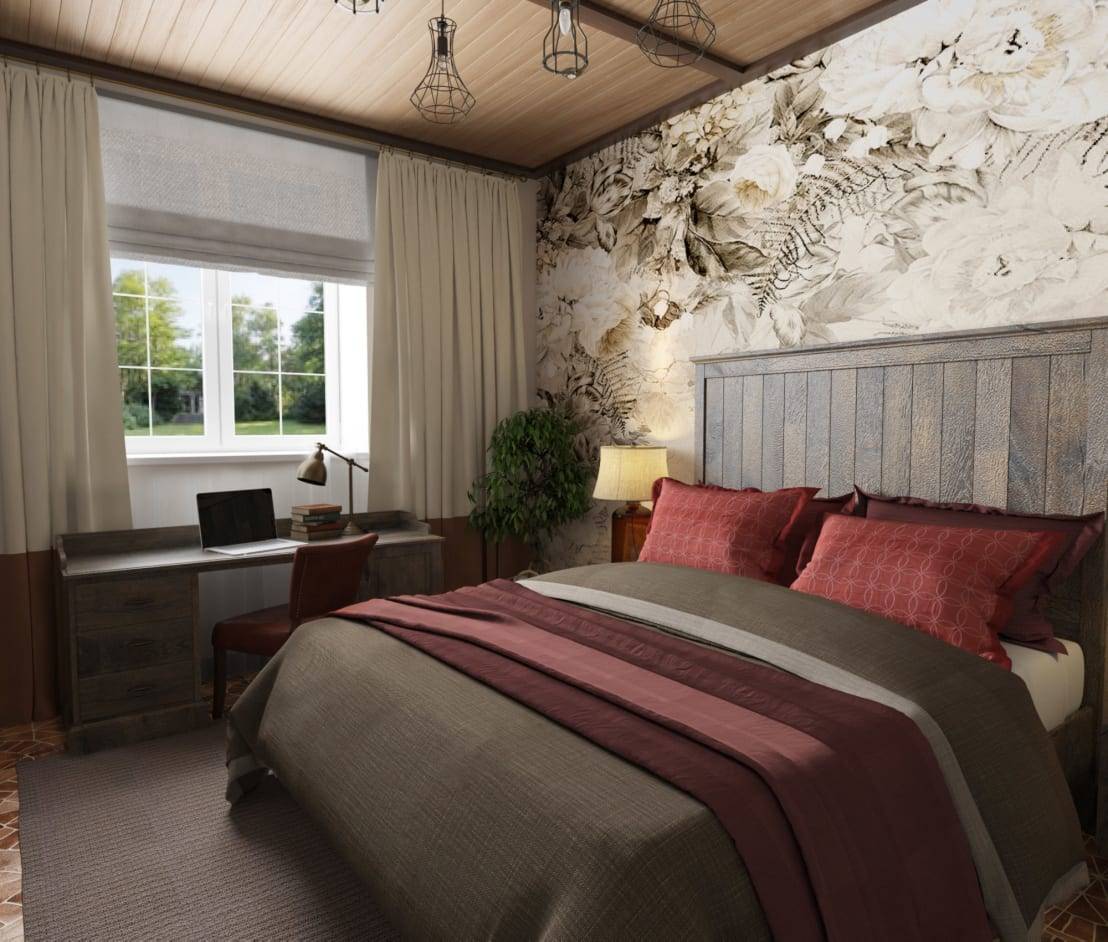 В отличии от гостиной, спальня может быть меньше по площади и иметь уникальный стиль интерьера. Особенно колоритно в деревянном доме смотрится интерьер спальни в стиле кантри. Классический, деревенский, русский и подобные стили тоже будут как нельзя кстати.