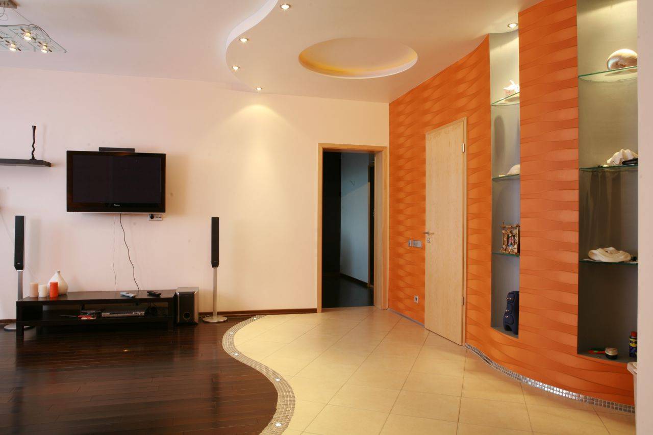 Переходим к статичным элементам, которые необходимо возводить ещё на этапе ремонта. Гипсокартон — удивительный материал. При необходимых навыках из него можно возвести не только прямую глухую стену, но и конструкцию любой формы с полками для хранения, декоративными нишами и другими атрибутами.