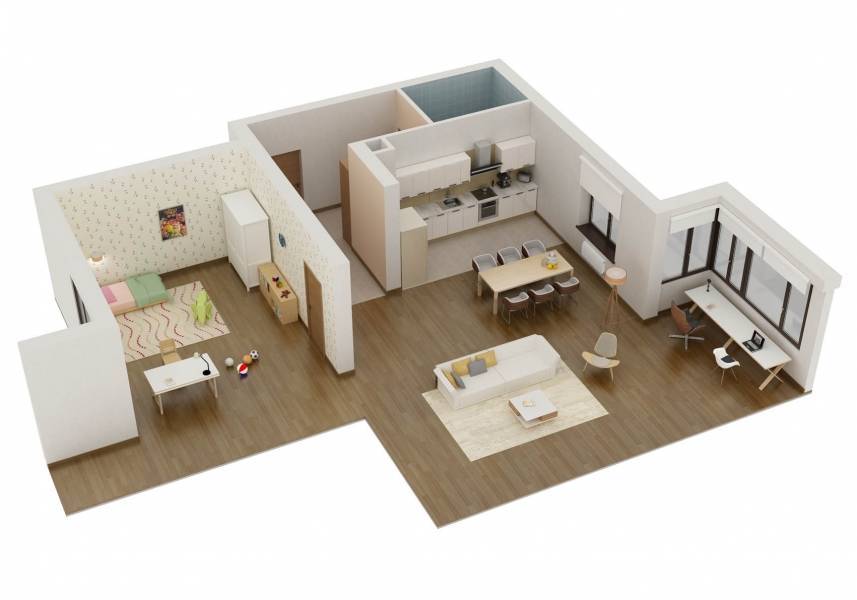 - первый вариант: кухня-столовая-гостиная и спальня с выделенным рабочим местом;
