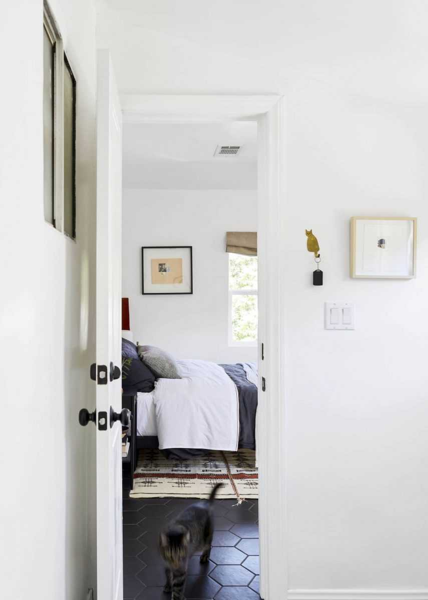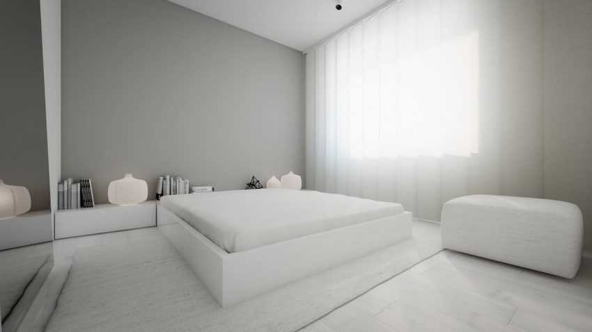 Чтобы не усложнять себе жизнь, положи на пол в минималистичной спальне обычный ламинат. Он практичнее и разнообразнее паркета, не такой капризный в уходе, но все равно – теплый и уютный. Если делаешь полы с подогревом – можешь взять крупную плитку, а у кровати простелить мягкий коврик.