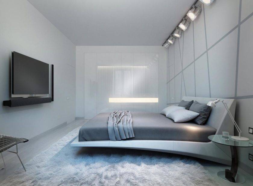 Палитры, которые любит спальня в стиле хай-тек: фиолетовая, стальная, белая, черная.