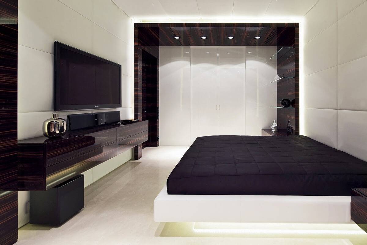 Современная спальня имеет техническое оснащение: плазменные телевизоры, стереосистемы смотрятся в ней стильно и уместно.