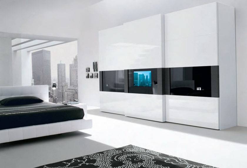 Шифоньеры в условиях стиля хай-тек чаще всего спрятаны, утоплены в стенах. Но речь не о банальных купейных шкафчиках с дверцами-зеркалами. Такой предмет меблировки стал слишком уж обычным, а банальность – враг хай-тека. В тренде шкафы с распашными, отделанными алюминием дверцами, а также радиусные угловые шкафчики-купе.