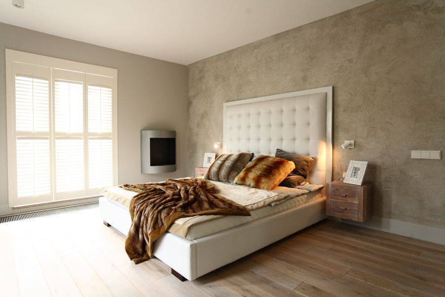 Оформление спальни в стиле минимализм можно сделать с помощью разнообразных современных и природных отделочных материалов. Идеально подойдет дерево, мрамор, бетон. Благодаря использованию различных текстур создается ощущение заполненности комнаты, и она не выглядит пустой.