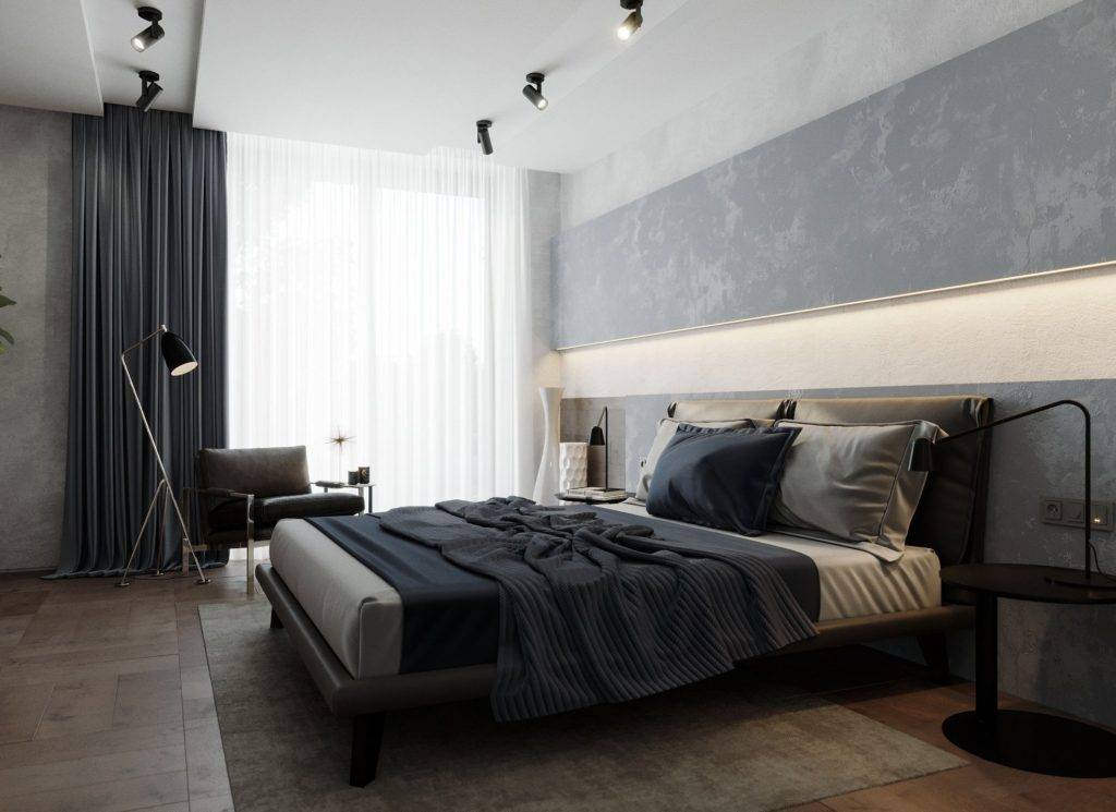 Подобное лаконичное и немного строгое оформление с отсутствием дополнительных декоративных элементов в виде рюша, кружева и прочего, особенно подходит для спальной комнаты холостяка. В мужском минимализме применяются максимально функциональные детали в сочетании с отделкой, выполненной в шоколадных, кофейных, серебряных, стальных или черно-белых тонах.