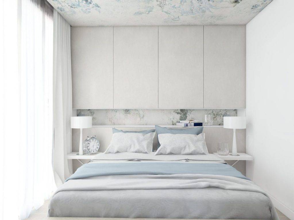 Если пространство спальни маленькое, то откажитесь от идеи массивной мебели. Замените раму платформой для установки матраса. Вместо тумбочек вы можете выбрать подвесные полки, прикрепленные к стене или каркасу кровати. Таким образом, вы сэкономите место, и вся комната будет выглядеть более воздушной.