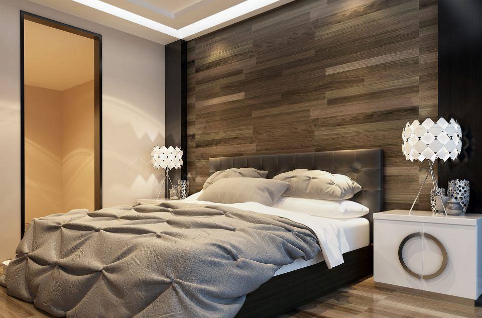 Важным плюсом обоев является то, что с их помощью можно довольно бюджетным способом зонировать пространство спальни, не прибегая к кардинальным изменениям интерьера. Допускается выделение зоны спального места деревянными панелями.