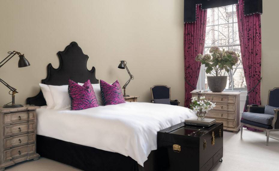 Для подчеркивания мягкости и глубины темной расцветки можно обратиться к рисункам на шторах подходящего стиля, красивому постельному белью и другим гармоничным предметам мебели. Но комната в стиле старого черно-белого фильма будет смотреться незавершенной, если ее не разбавить элементами более насыщенных тонов. Например, это могут быть интересные детали черничного, морковного, розового, светло-голубого или салатового оттенка.