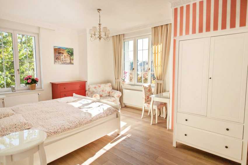 Пол может быть выполнен плиткой. В квартирах многоэтажных домов для такого решения стоит использовать систему подогрева, чтобы спальня была более уютной и комфортной в межсезонье. Для стиля характерными считаются белые деревянные двери и рамы на окна.